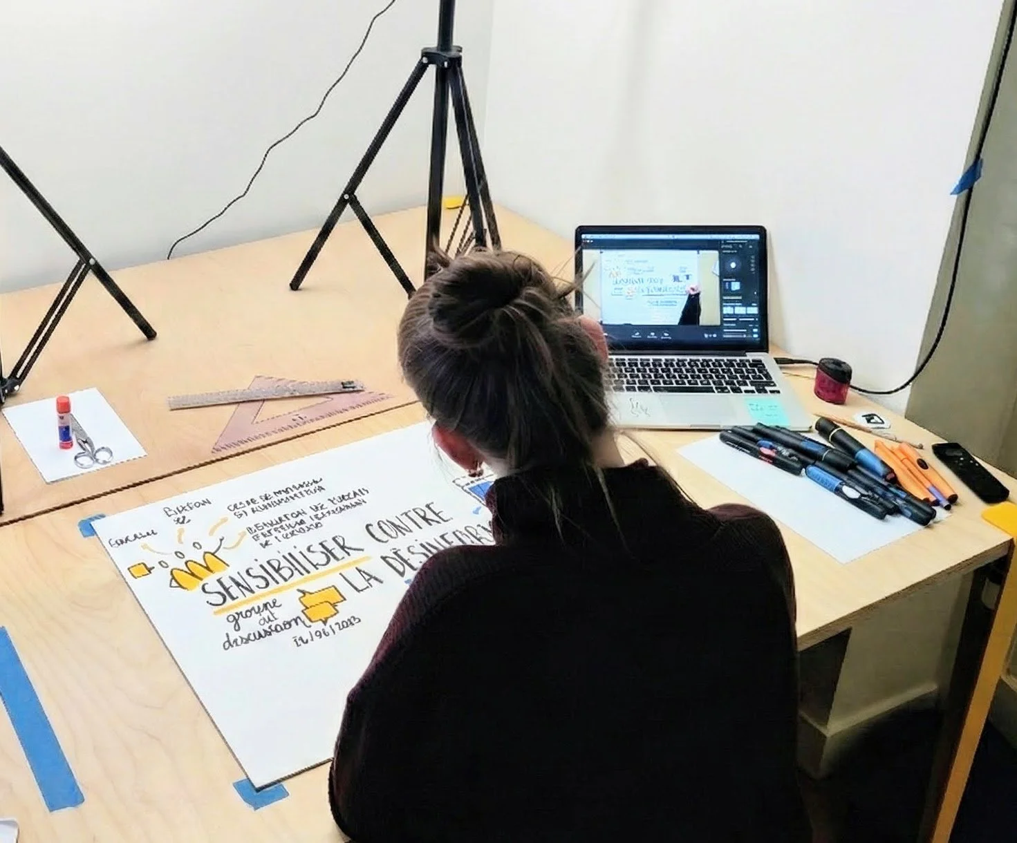 Je crée en temps réel une fresque qui vous sera restituée à la fin de l’événement. Les personnes participantes sont invitées à en photographier le résultat.
